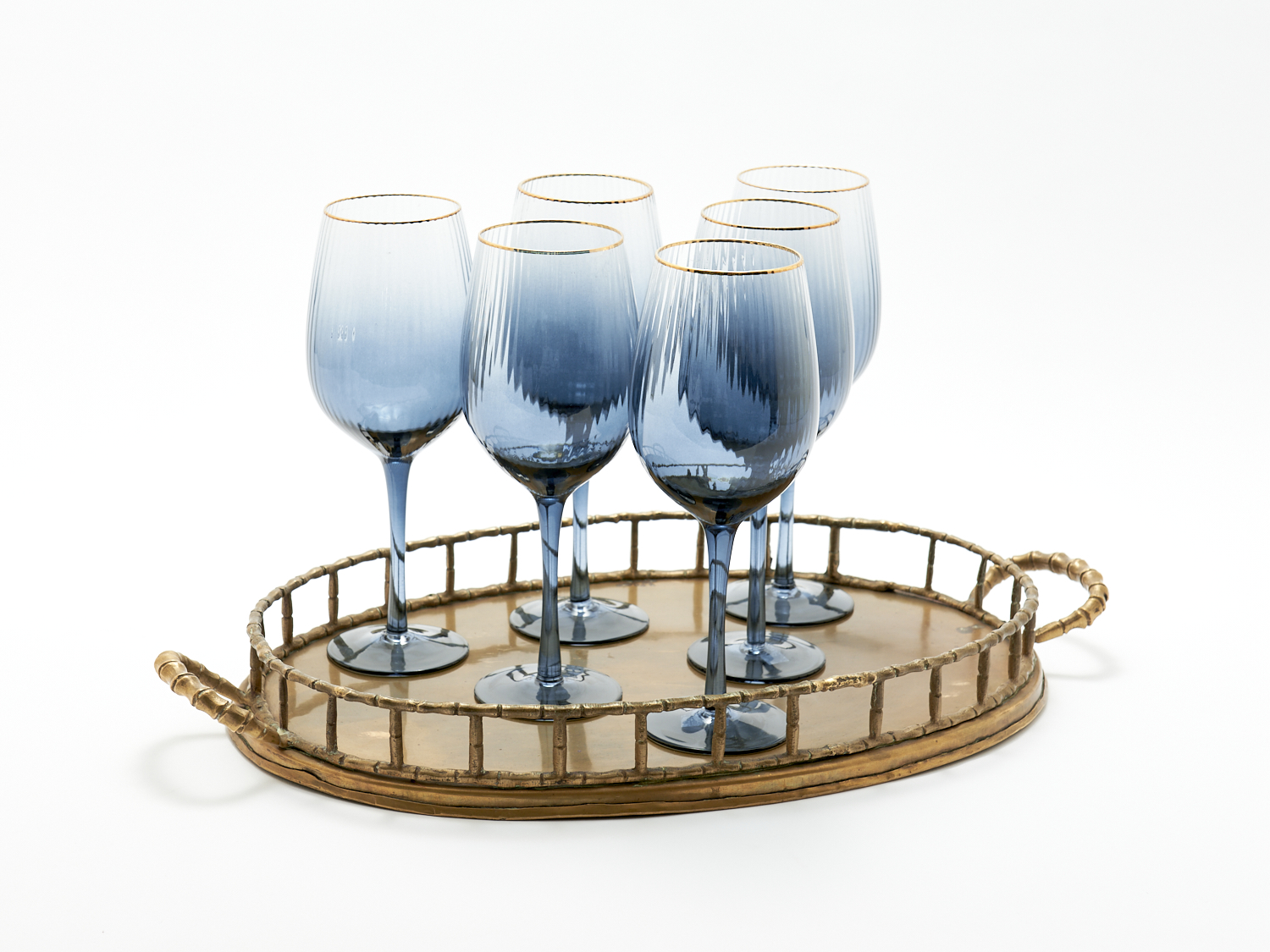 A VINTAGE BRASS GALLERY TRAY WITH A SET OF SIX GILT RIM BLUE GLASS WINES H.22.5CM (GLASS), LEONARD JOEL LOCAL DELIVERY: MEDIUM