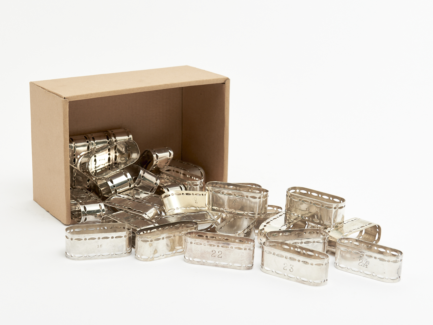 A SET OF SILVER PLATE NAPKIN RINGS SEQUENTIALLY NUMBERED 1 TO 30, LEONARD JOEL LOCAL DELIVERY: SMALL