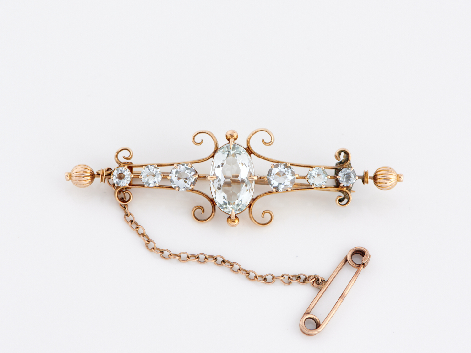 A VICTORIAN AQUAMARINE BAR BROOCH IN 15CT GOLD, LENGTH 60MM, 6.75GMS