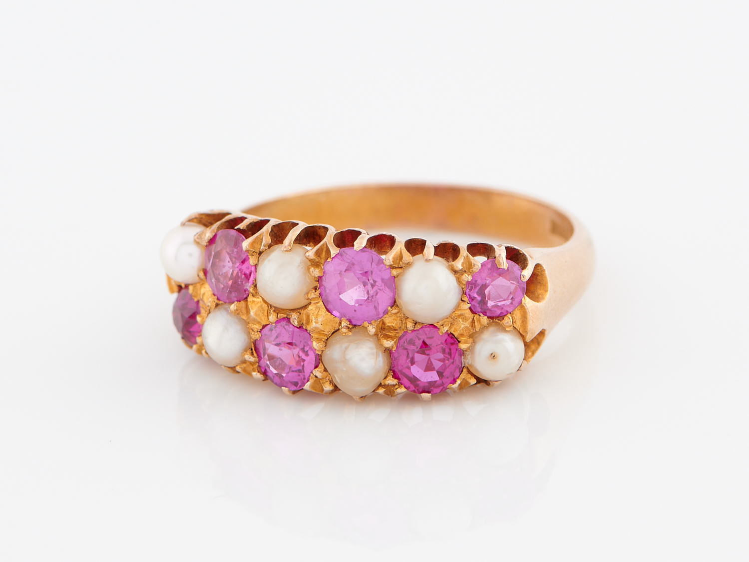 AN EDWARDIAN PEARL AND RED STONE RING IN 15CT GOLD, RING SIZE R, 6.99GMS