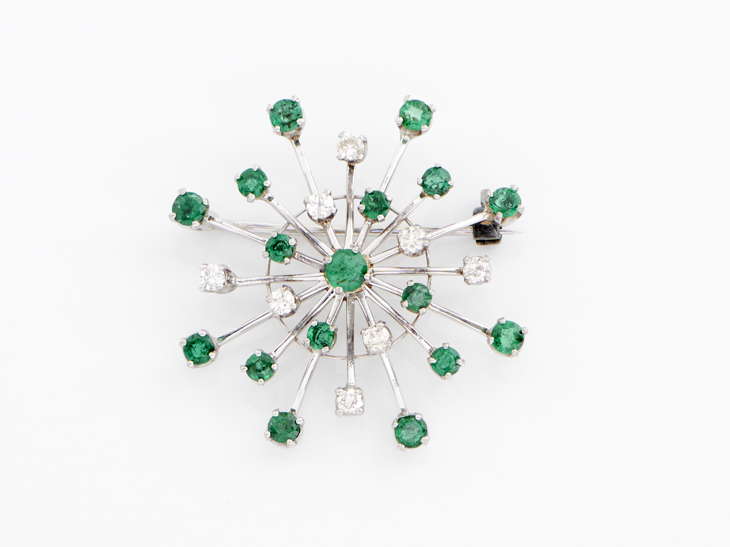 A VINTAGE EMERALD AND DIAMOND STARBURST BROOCH IN 18CT WHITE GOLD, DIAMETER APPROXIMATELY 36MM, 7.32GMS