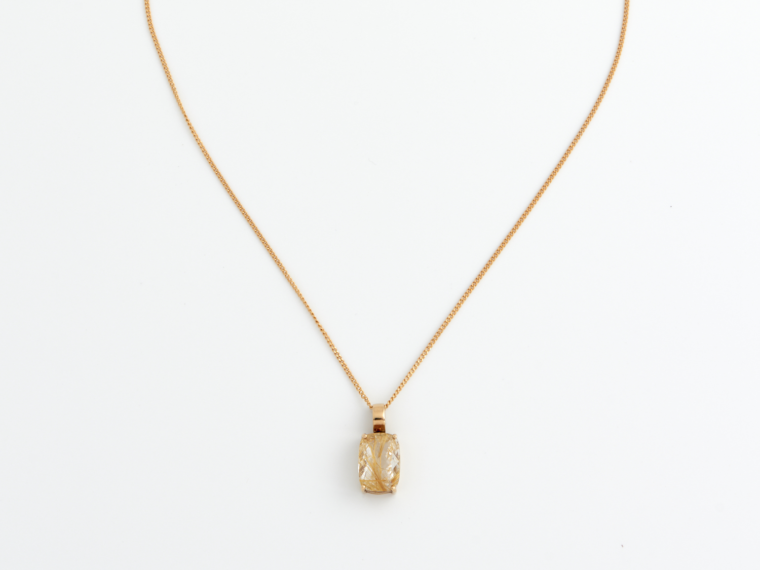 A RUTILATED QUARTZ PENDANT NECKLACE IN 9 CT GOLD AND A PLATED CHAIN, 5.20 GMS