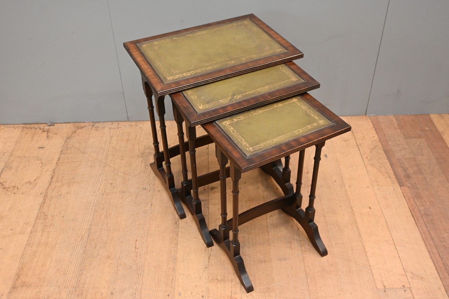 A SET OF THREE REGENCY-STYLE LEATHER-LINED MAHOGANY NESTING OCCASIONAL TABLES (A/F) (56H X 50W X 38D CM) (LEONARD JOEL DELIVERY SIZE: LARGE)