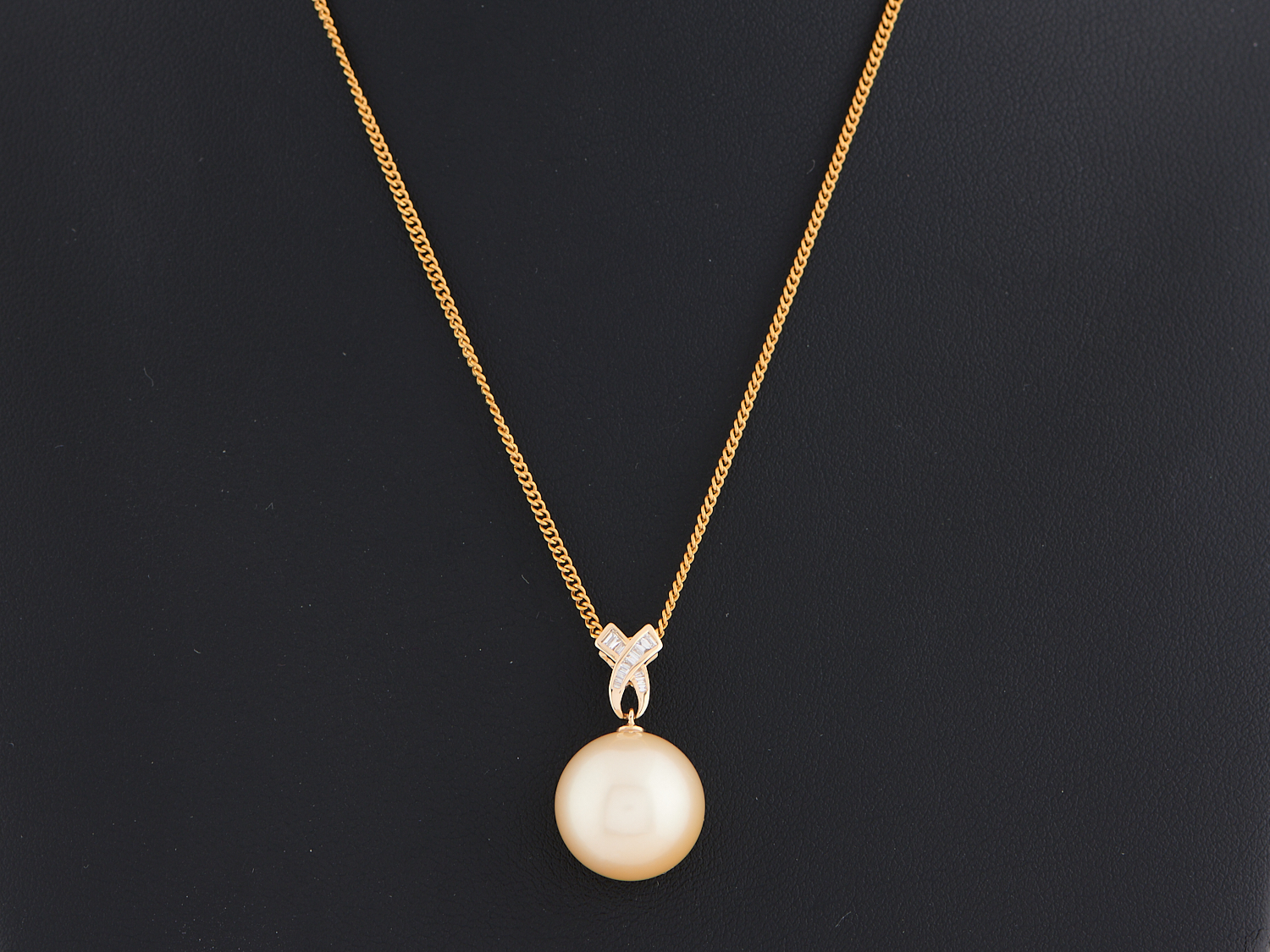 A 14.6MM GOLDEN SOUTH SEA PEARL AND DIAMOND PENDANT IN 18CT GOLD, TO A DISPLAY CHAIN