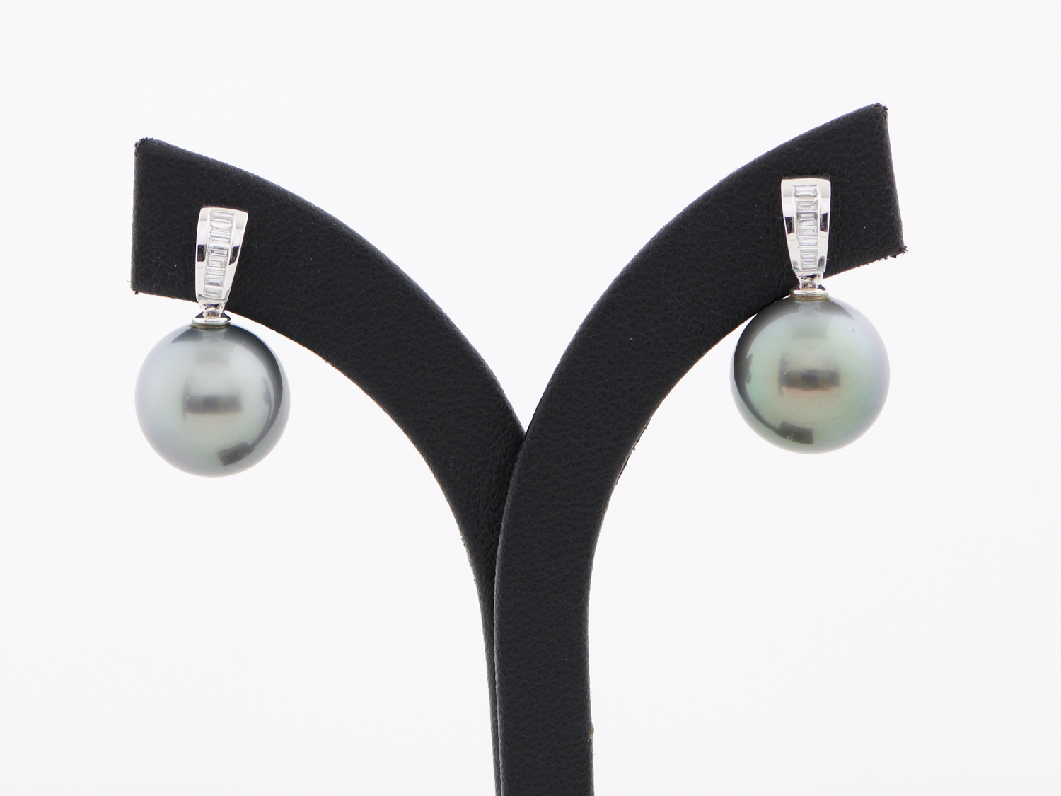 A PAIR OF TAHITIAN PEARL AND DIAMOND EARRINGS IN 18CT WHITE GOLD, PEARLS MEASURING 12.5MM, DIAMONDS ESTIMATED AT 0.14CTS, TO POST AND BUTTERFLY FITTINGS