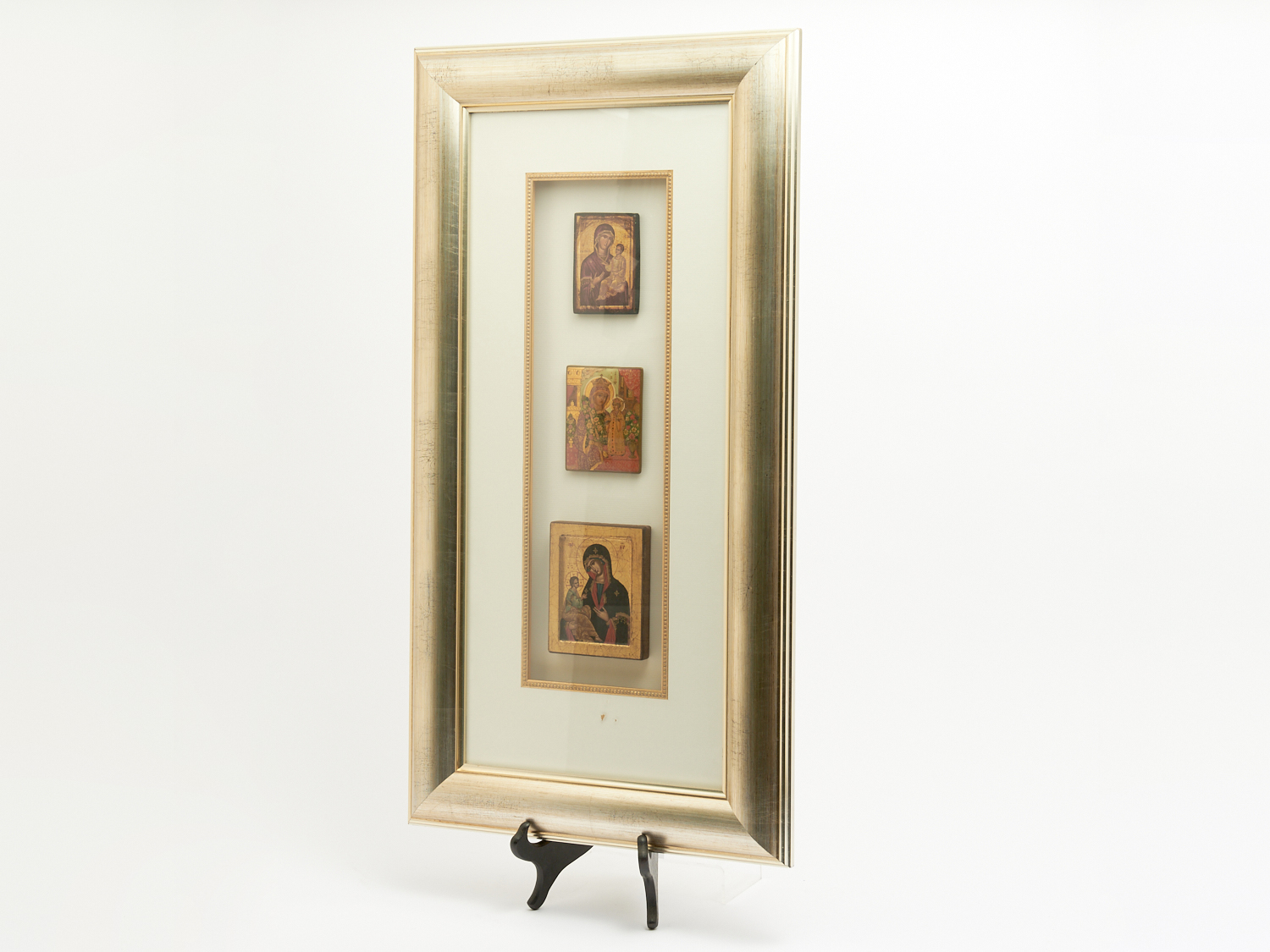 A GROUP OF THREE SMALL ICONS, TWO PAINTED AND ONE A PHOTOGRAPHIC REPRODUCTION, FRAMED AS ONE H.75 X W.40CM, LEONARD JOEL LOCAL DELIVERY: MEDIUM