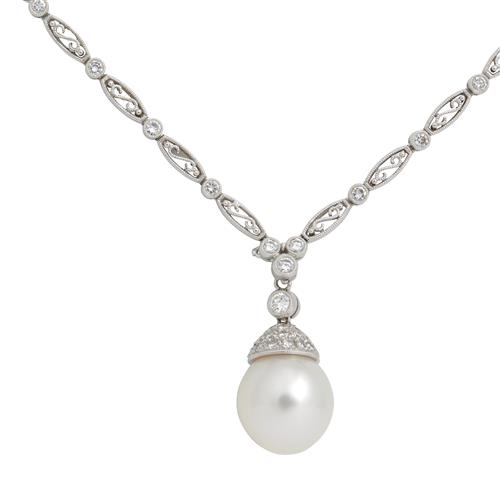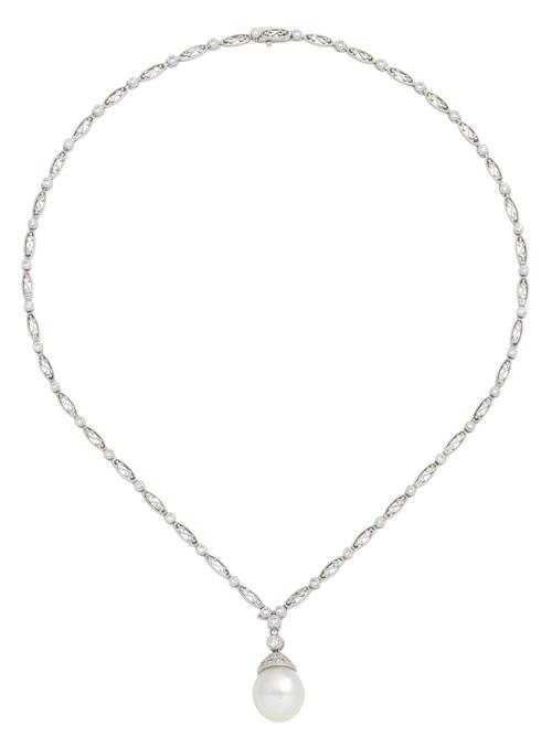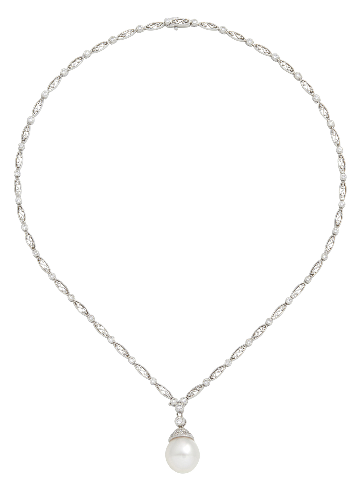 Comprising a detachable pendant set with a near round pearl of white hues measuring approximately 12.70mm, to a diamond set cap, suspended from a fancy link chain composed of openwork links spaced by collet-set brilliant-cut diamonds, the diamonds together weighing approximately 2.49 carats, completed by a tongue and groove clasp, length approximately 420mm.