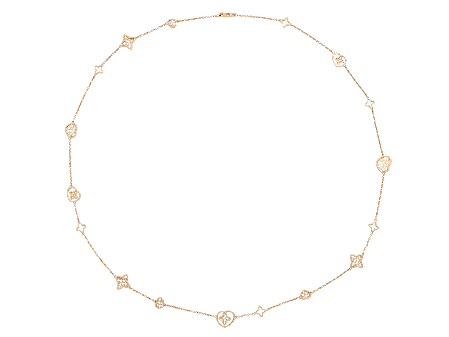 Designed as a long chain set at intervals with openwork heart and Louis Vuitton monogram motifs, completed by a parrot clasp, signed LV and numbered 025868, length approximately 850mm.