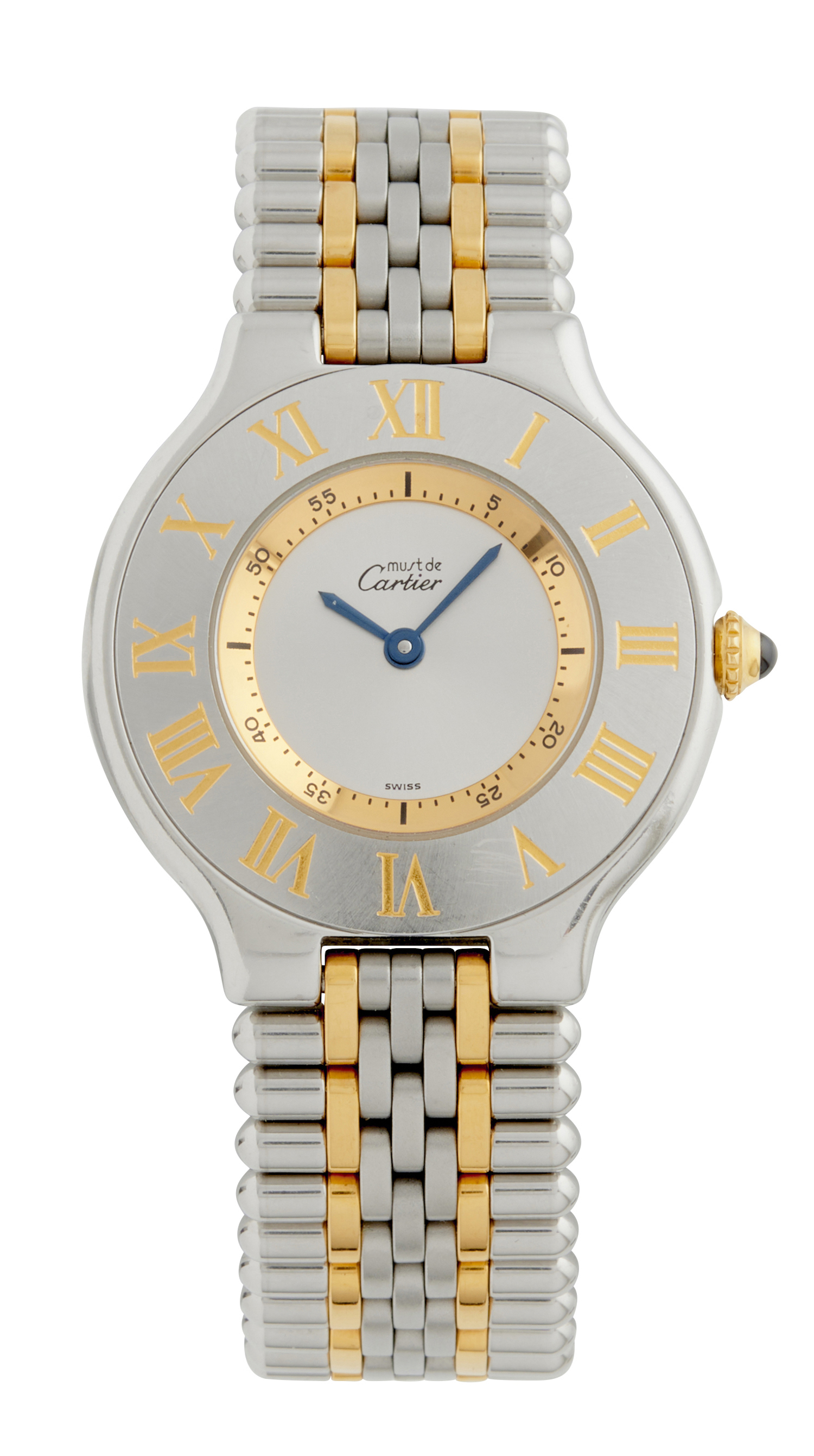 Closure: Cartier fitted brushed and polished stainless steel link bracelet with gilt accents and double folding clasp