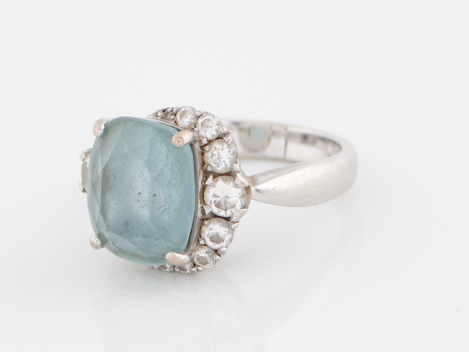 AN AQUAMARINE AND DIAMOND RING IN 18CT WHITE GOLD, RING SIZE M, THE AQUAMARINE OF 4.00CTS, 8.0GMS