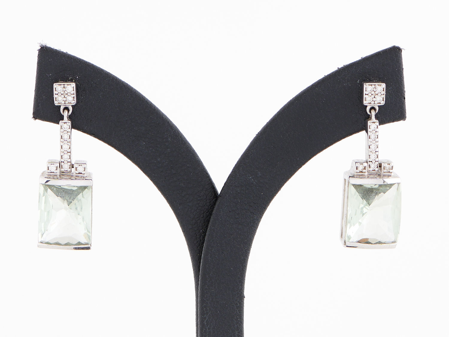A PAIR OF AQUAMARINE AND DIAMOND EARRINGS IN 9CT WHITE GOLD, TO POST AND BUTTERFLY FITTINGS, LENGTH 26MM