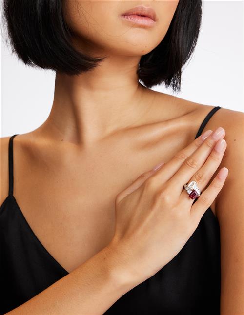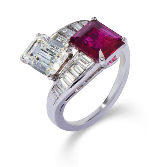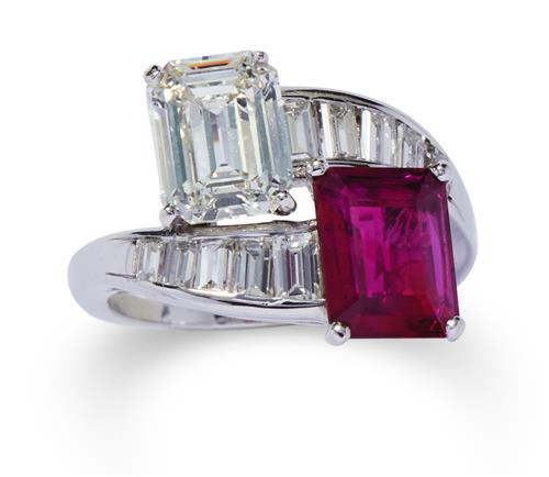 Of toi et moi design, terminating in a claw-set rectangular-shaped ruby weighing 1.88 carats, and an emerald-cut diamond weighing 1.82 carats, the shoulders channel-set with a line of baguette diamonds, the small diamonds together weighing approximately 0.92 carats, mounted in 18ct white gold, size K1/2.