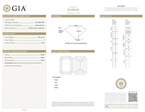 a GIA report numbered 5212051652 dated 15 July 2020, stating that the 1.82 carat diamond is natural, J colour, VS2 clarity.