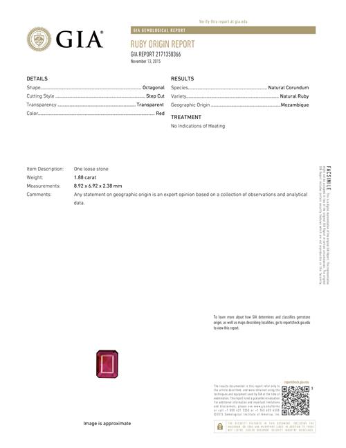 a GIA report numbered 2171358366, dated 13 November 2015, stating that the 1.88 carat ruby is natural, with no indications of heating, of Mozambique origin;