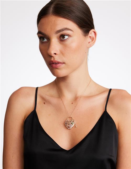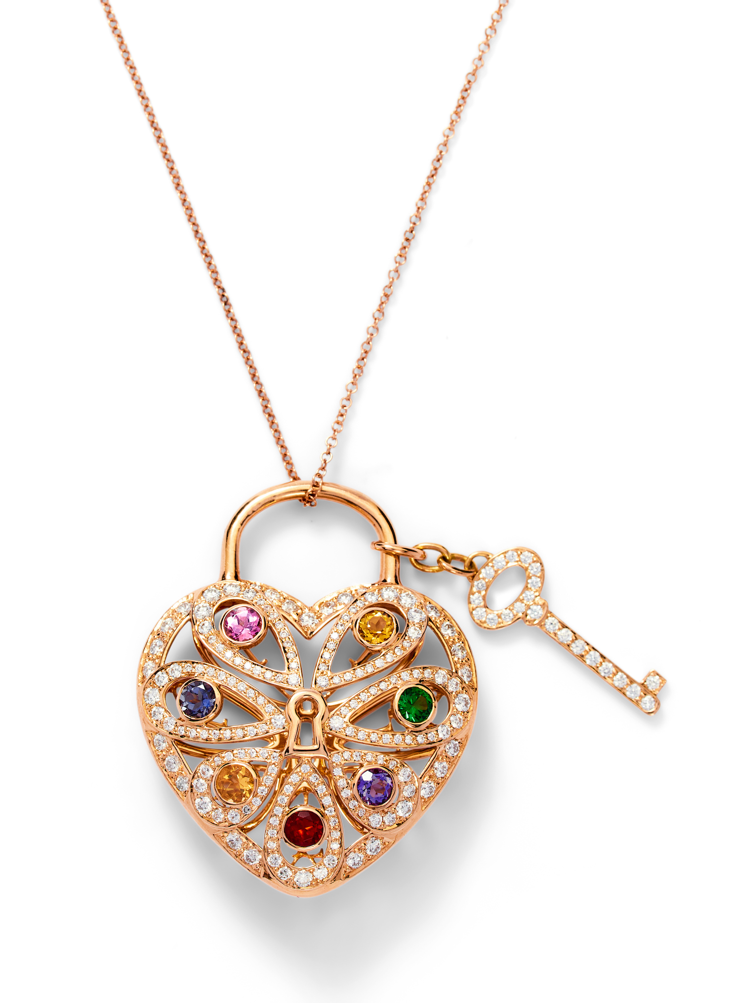 Of bombé form, the openwork heart shaped padlock is pavé-set to the front with brilliant-cut diamonds between collet-set circular-cut gemstones including citrine, tsavorite, amethyst, fire opal, yellow opal, iolite and pink tourmaline supported by a key charm pavé-set to the front with diamonds, the reverse featuring an openwork foliate pattern with 'TIFFANY' logotype, supported from a trace chain, the diamonds together weighing 2.76 carats, mounted in 18ct pink gold, pendant length 38mm, pendant width 30mm, inner circumference 460mm, signed T&Co. for Tiffany & Co.
