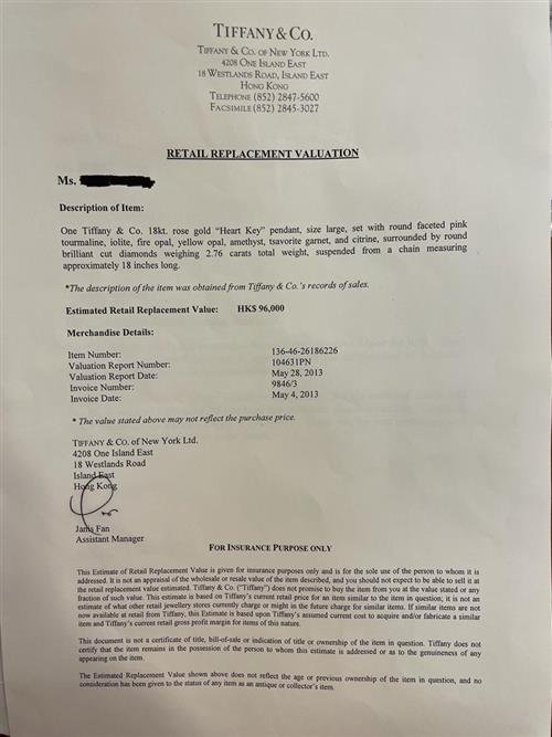 Accompanied by a facsimile Tiffany & Co. retail replacement valuation, numbered 104631PN, dated 28 May 2013.