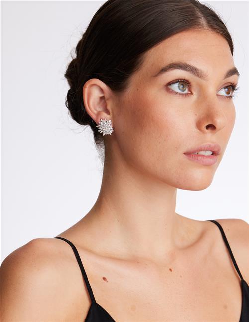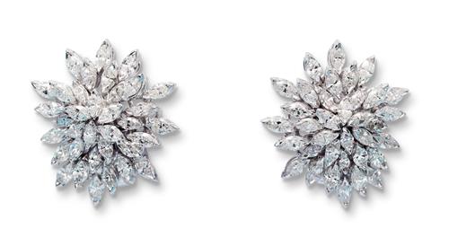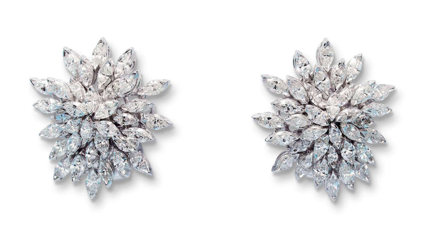 Each of cluster design, claw-set with marquise-shaped diamonds, the diamonds together weighing approximately 3.77 carats, mounted in 18ct white gold, length 22mm, width 20mm, post and clip fittings.