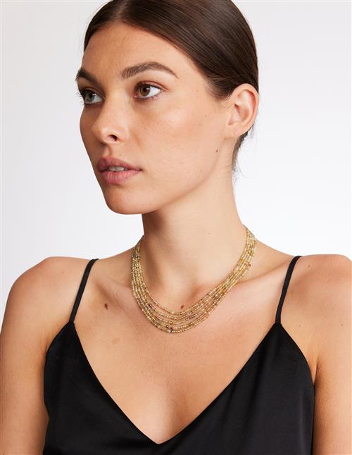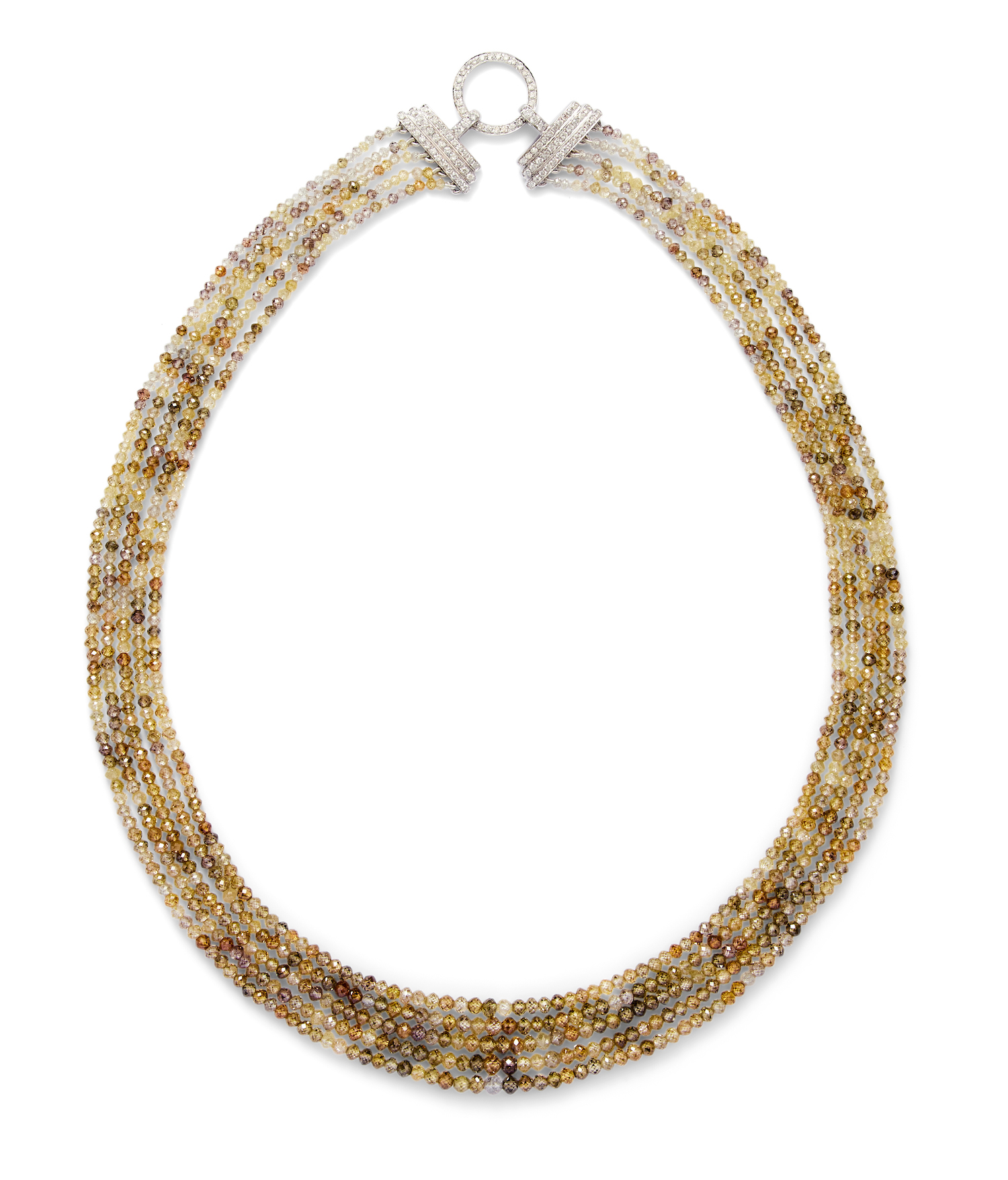 Comprising five lines of faceted diamond beads of brown tint completed by an 18ct white gold clasp pavé-set with near colourless brilliant-cut diamonds, the coloured and near colourless diamonds together weighing approximately 107.60 carats and 1.10 carats respectively, inner circumference 400mm.