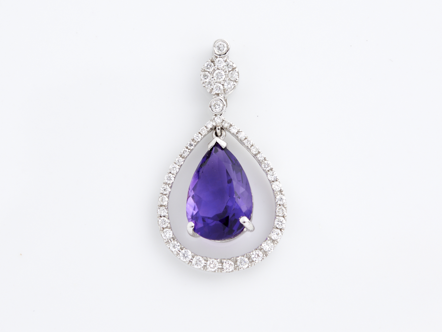 AN AMETHYST AND DIAMOND PENDANT IN 18CT WHITE GOLD, THE AMETHYST WEIGHING 2.80CTS, THE DIAMONDS TOTALLING 0.45CTS