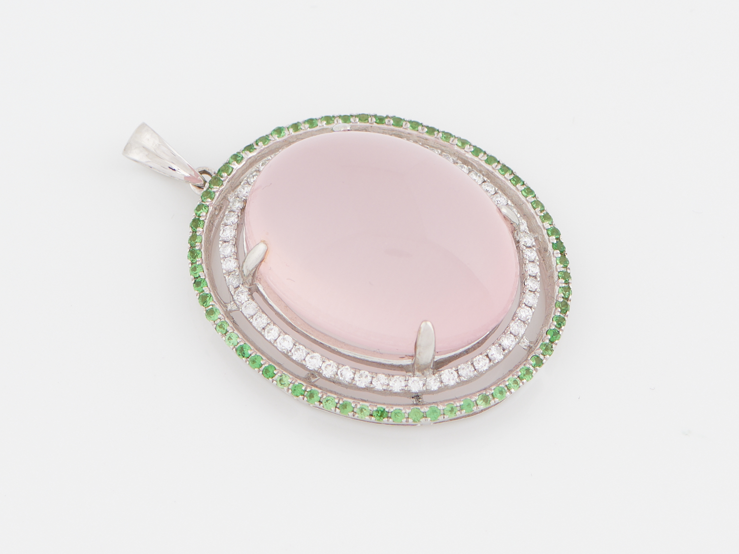 A ROSE QUARTZ, DIAMOND AND TSAVORITE GARNET PENDANT IN 18CT WHITE GOLD, 35 X 25MM