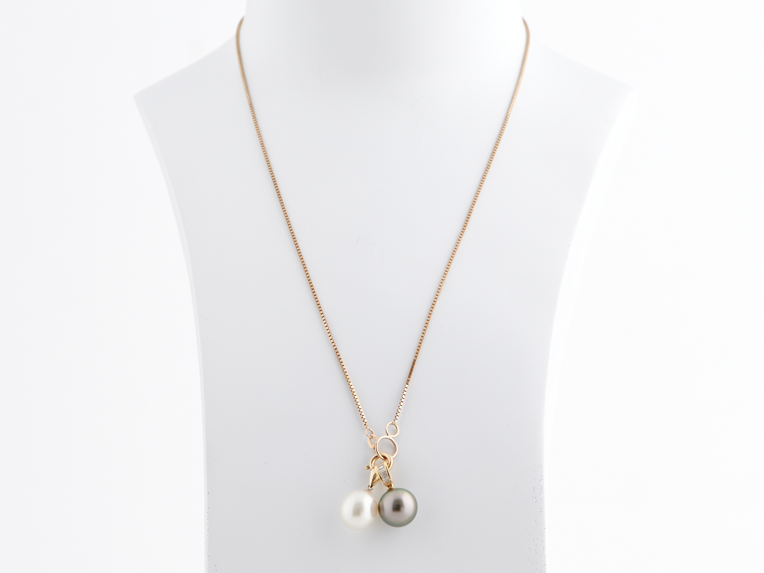 A TAHITIAN PEARL AND DIAMOND PEDANT IN 18CT GOLD, TOGETHER WITH A SOUTH SEA PEARL PENDANT AND BOX LINK CHAIN IN 9CT GOLD, THE CHAIN 560MM