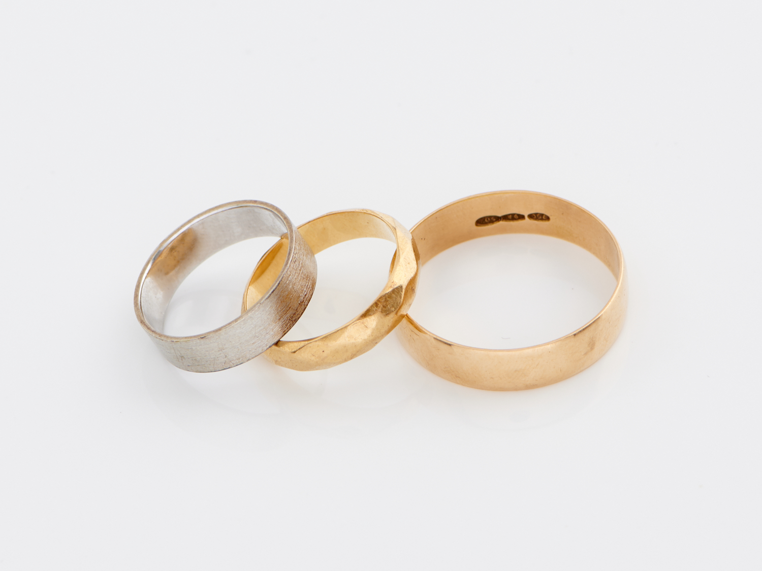 A COLLECTION OF THREE GOLD BANDS IN 18CT GOLD, SIZES K, K AND Y1/2, 10.8GMS