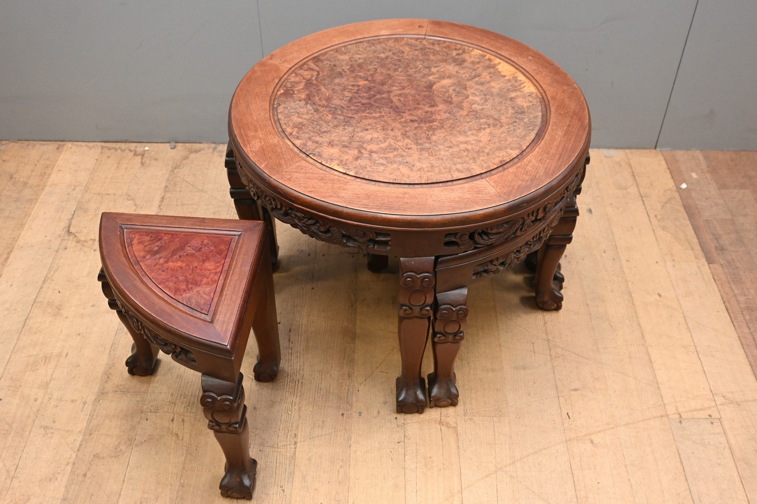 A CHINESE HARDWOOD SUITE OF A LOW TABLE AND FOUR STOOLS, EACH WITH AN INSET BURR WOOD TOP (A/F) (52H X 70DIA CM) (LEONARD JOEL DELIVERY SIZE: X-LARGE)