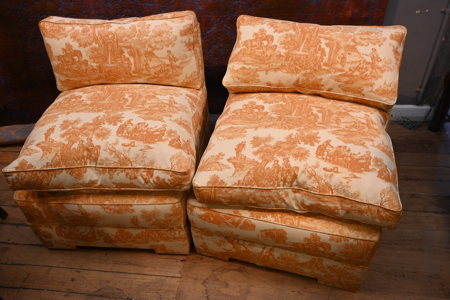 A PAIR OF FRENCH UPHOLSTERED DOWN FILLED CHAIRS (78H X 69W X 84D CM) (PLEASE NOTE THIS HEAVY ITEM MUST BE REMOVED BY CARRIERS AT THE CUSTOMER'S EXPENSE. LEONARD JOEL STAFF CANNOT ASSIST CARRYING THIS ITEM) (X-LARGE ITEM)
