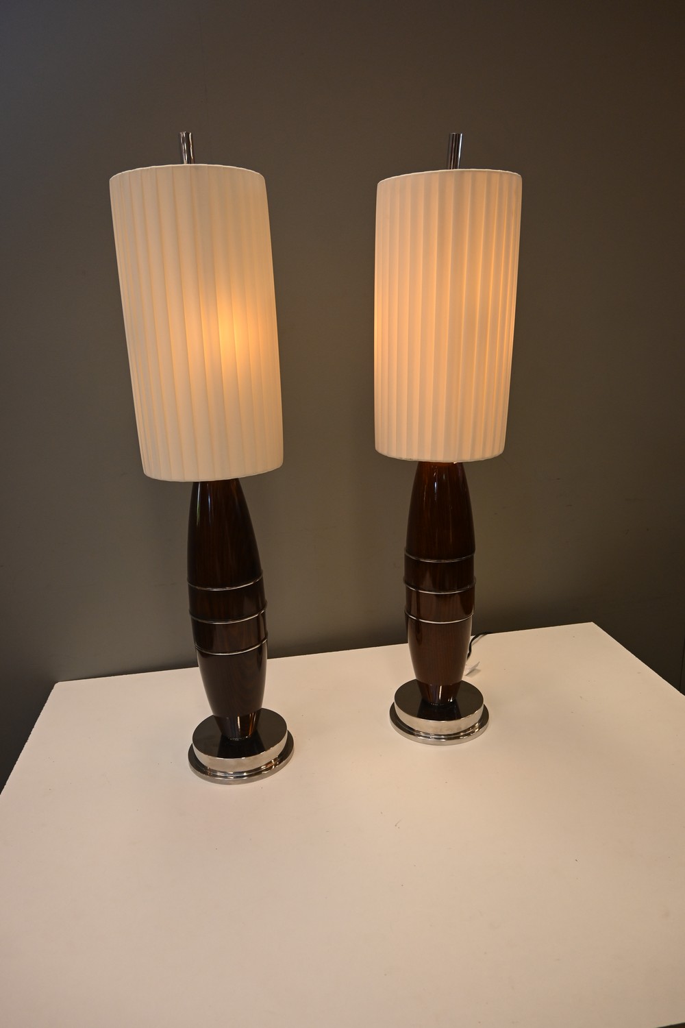 A PAIR OF CONTEMPORARY POLISHED TABLE LAMPS (A/F) (89H CM) (LEONARD JOEL DELIVERY SIZE: LARGE)