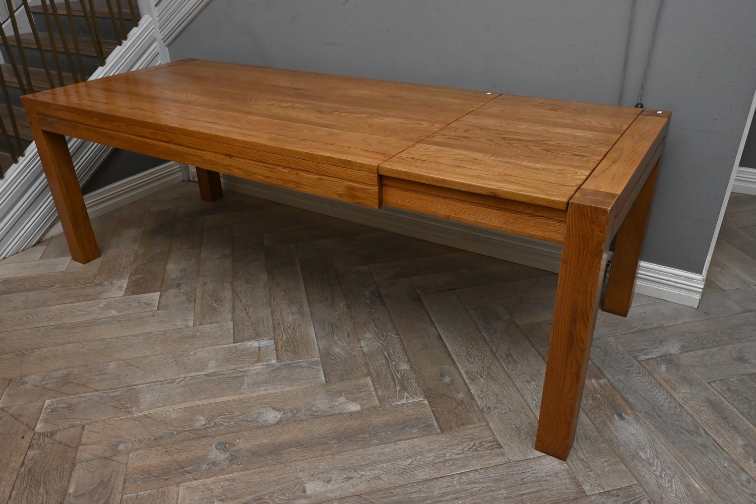 A CONTEMPORARY OAK EXTENSION DINNING TABLE (77H X 213 EXTENDED WIDTH X 180 UNEXTENDED WIDTH X 90D CM) (PLEASE NOTE THIS HEAVY ITEM MUST BE REMOVED BY CARRIERS AT THE CUSTOMER'S EXPENSE. LEONARD JOEL STAFF CANNOT ASSIST CARRYING THIS ITEM) (X-LARGE ITEM)