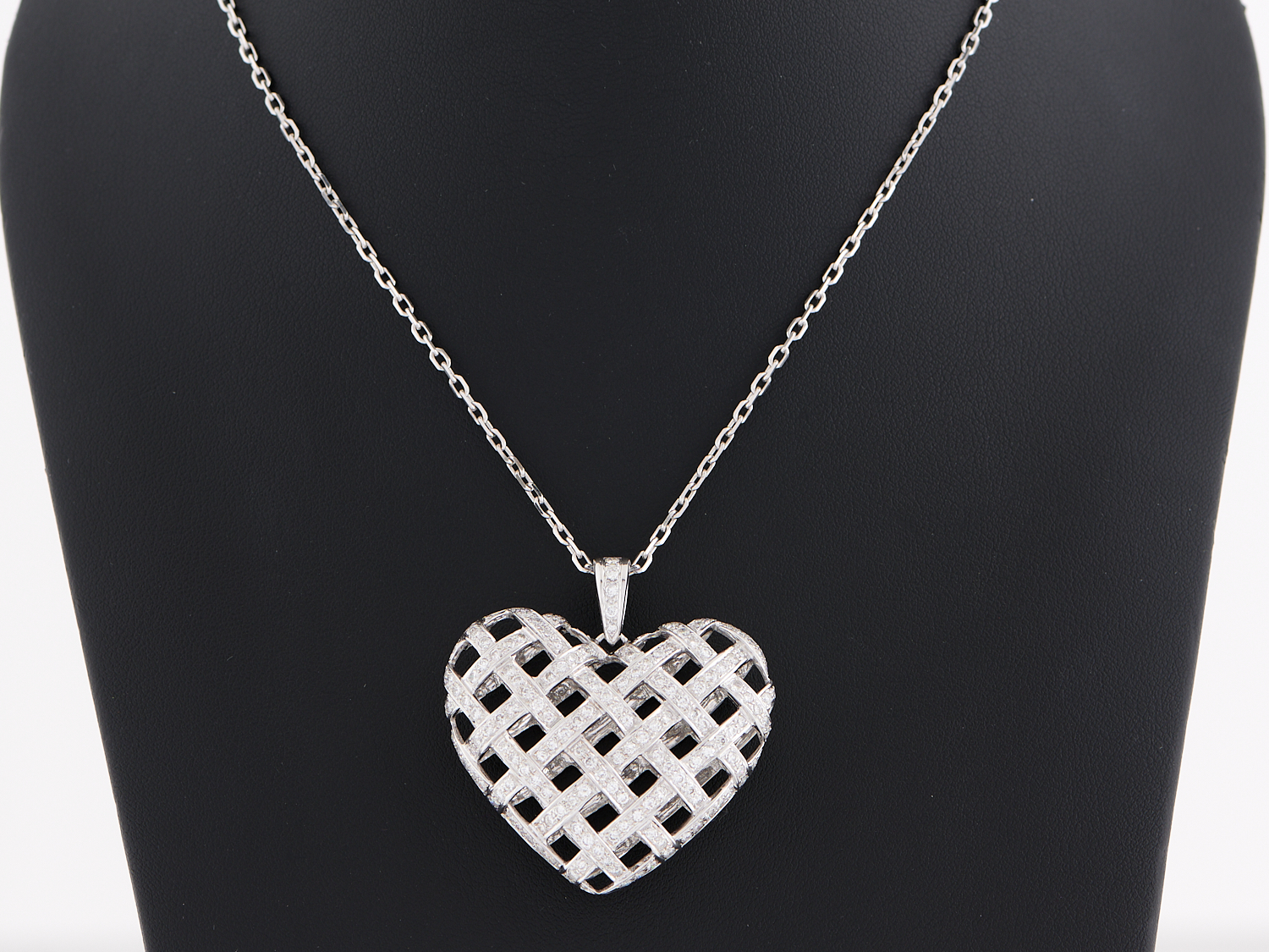 A OPENWORK DIAMOND HEART PENDANT IN 18CT WHITE GOLD, THE DIAMONDS TOTALLING 3.22CTS (F-G/SI) TO A CHAIN IN 18CT WHITE GOLD, THE PENDANT 50 X 45MM, THE CHAIN LENGTH 500MM, 26.51GMS