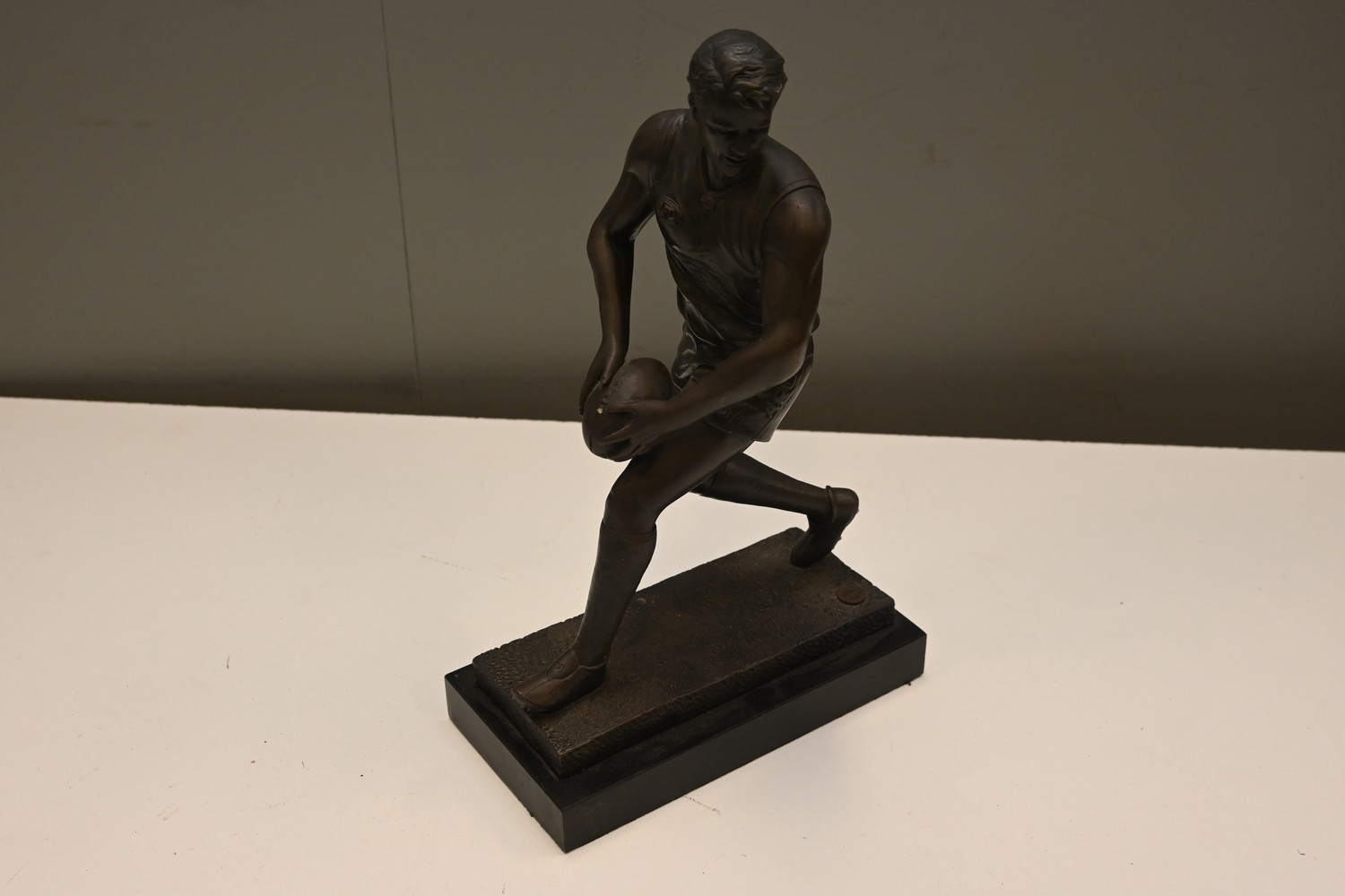 A BRONZE FOOTBALL STATUE (38H CM) (LEONARD JOEL DELIVERY SIZE: MEDIUM)