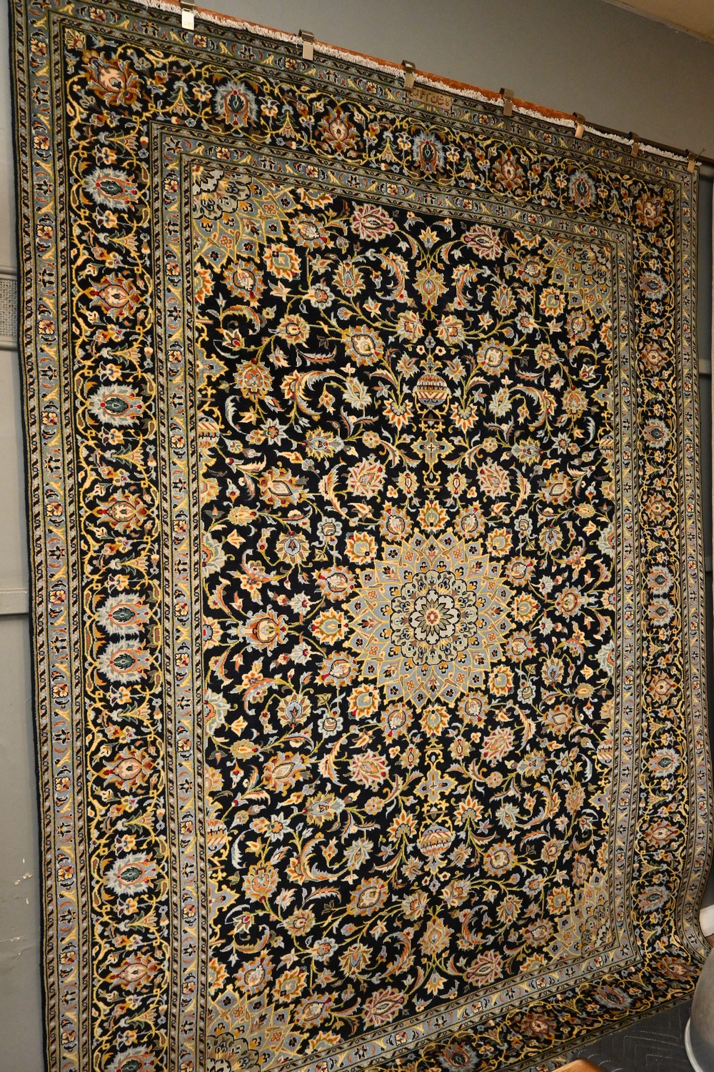 AN EX GALLERY-PERSIAN ROYAL KASHAN CARPET. 100% WOOL. DENSE AND SOLID PILE. CLASSIC KASHAN DESIGN OF A CENTRAL ELONGATED MEDALLION WITH FRENCH BLUE AND GOLD TONES ON A FIELD OF ALL-OVER PALMETTES, SCROLLS, FLORAL MOTIFS & SAZ LEAVES ON A ROYAL PERSIAN DEEP BLUE FIELD. CORNER MEDALLIONS IN TONES OF FRENCH BLUE, SAGE GREEN AND GOLD, MAJOR BORDER OF SHAH ABBASI PALMETTES, FLORAL MOTIFS & SAZ LEAVES IN FRENCH BLUE, SAGE GREEN AND GOLD TONES. SIZE: 346 X 250 CM. ORIGIN: KASHAN/IRAN - RRP: $5,900. DOCUMENTATION OF AUTHENTICITY INCLUDED