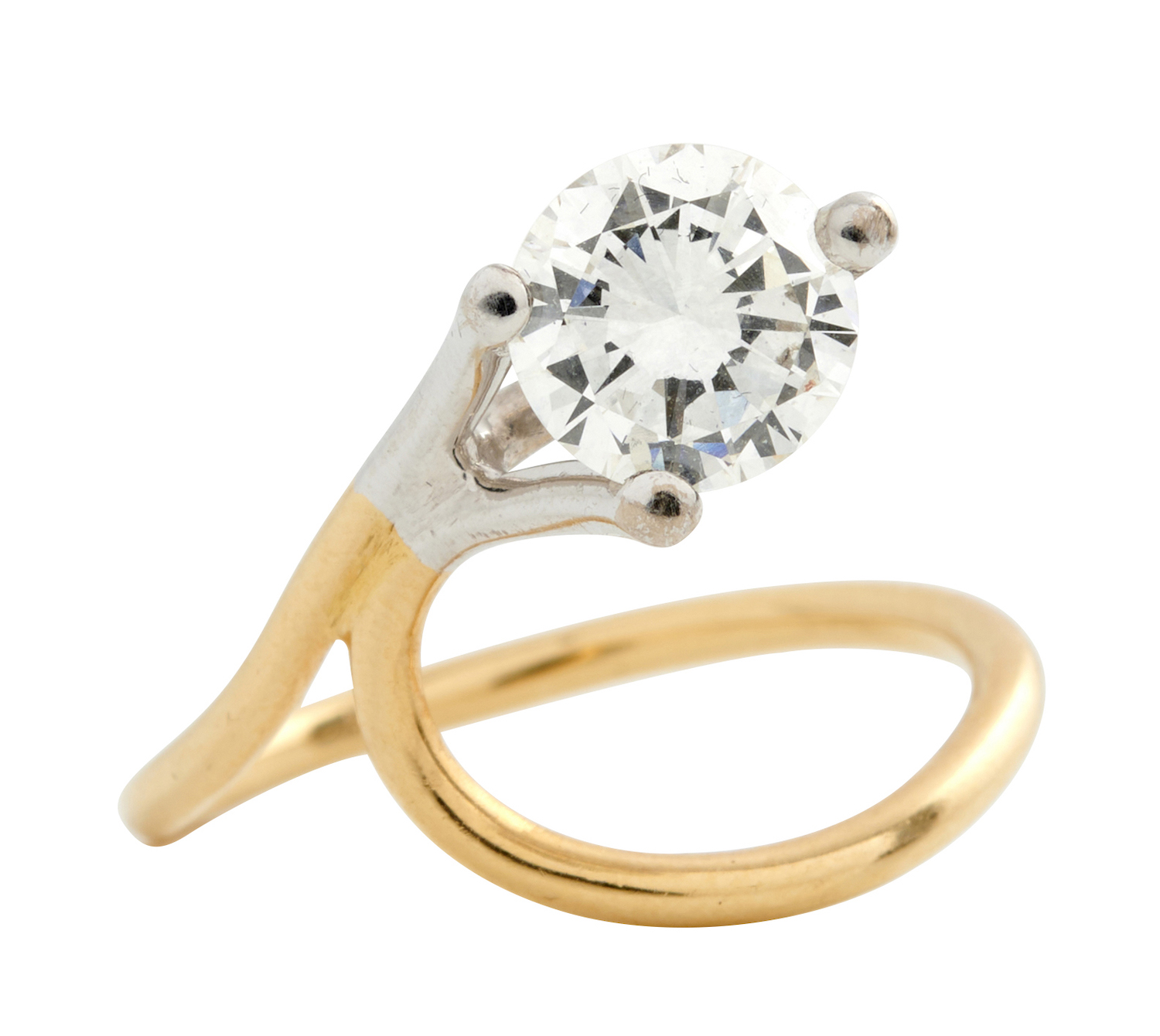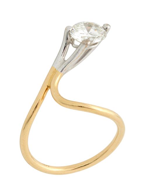 Claw-set with a brilliant-cut diamond weighing approximately 1.20 carats, within a raised abstract setting, size N.