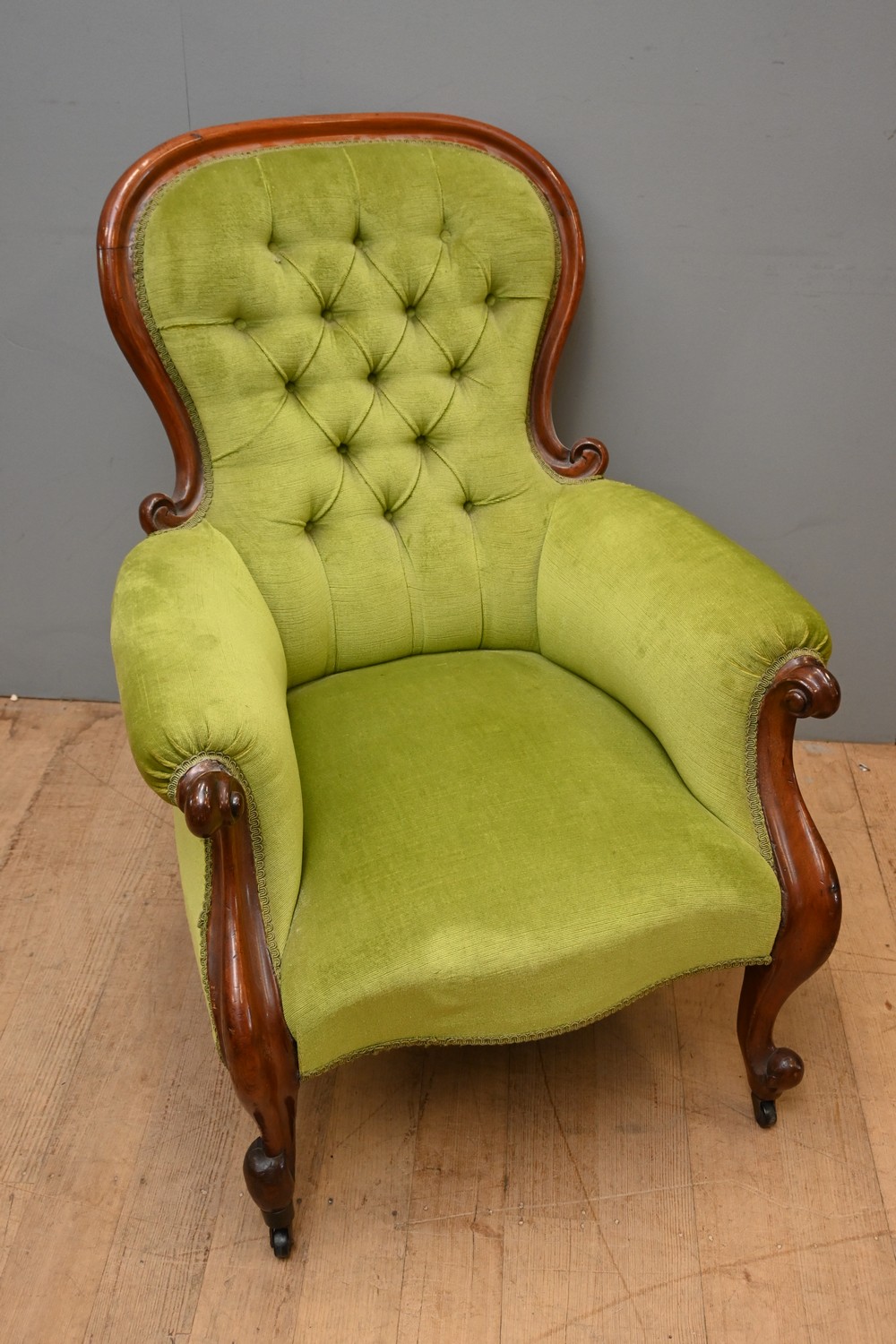 A VICTORIAN AUSTRALIAN CEDAR AND UPHOLSTERED ARMCHAIR (A/F) (100H X 75W X 79D CM) (LEONARD JOEL DELIVERY SIZE: X-LARGE)