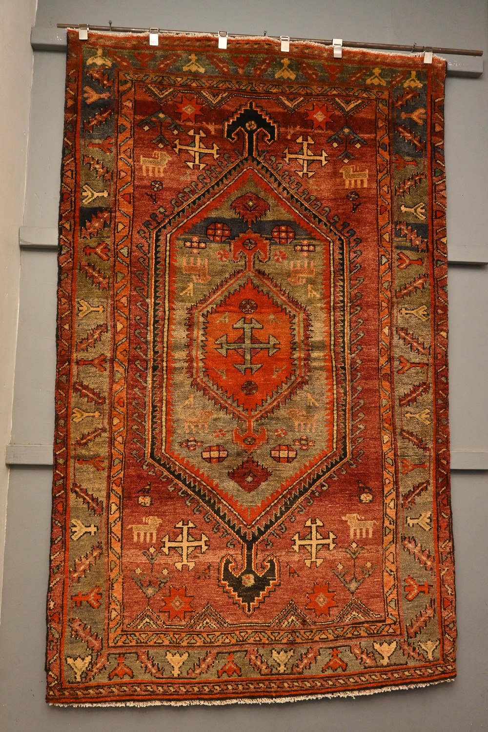 A COLOURFUL PERSIAN KHAMSEH RUG.100% HAND-SPUN EXTREMELY PLUSH WOOL PILE USING ALL NATURAL DYES. TRIBAL DESIGN WITH AN ANCHORED HEXAGONAL MEDALLION IN A FIELD OF TRIBAL ANIMAL MOTIFS, STAR MOTIFS AND CROSS SYMBOLS - SYMBOLIZING ARMENIAN CHRISTIAN WEAVERS. SIZE: 246 X 148 CM. ORIGIN: PERSIA - RRP: $2,900. DOCUMENTATION OF AUTHENTICITY INCLUDED