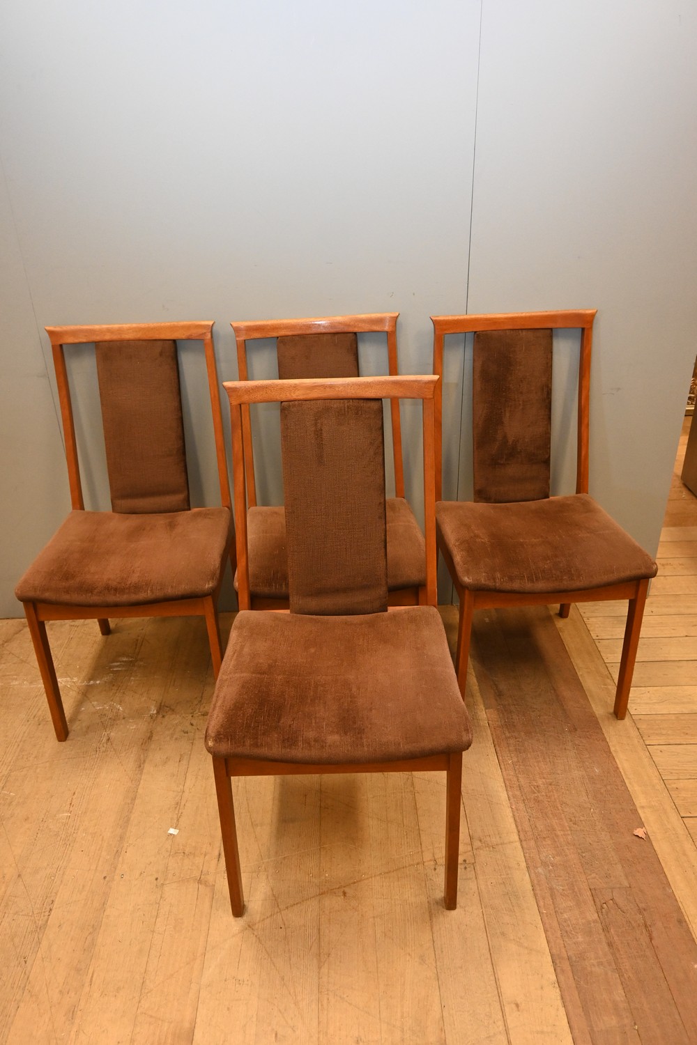 A SET OF FOUR MID-CENTURY UPHOLSTERED DINNING CHAIRS BY BURGESS (A/F) (91H X 45W X 50D CM) (LEONARD JOEL DELIVERY SIZE: LARGE)