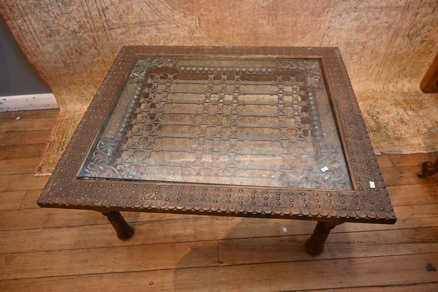 A MOROCCAN DOOR FRAME WITH GLASS TOP CONVERTED TO COFFEE TABLE (46H X 90W X 100D CM) (PLEASE NOTE THIS HEAVY ITEM MUST BE REMOVED BY CARRIERS AT THE CUSTOMER'S EXPENSE. LEONARD JOEL STAFF CANNOT ASSIST CARRYING THIS ITEM) (X-LARGE ITEM)
