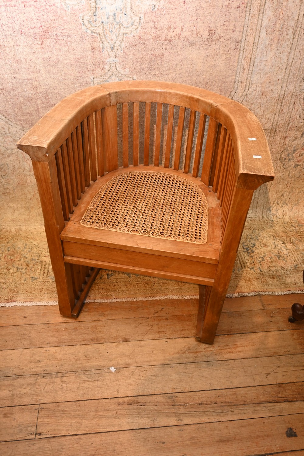 A MID-CENTURY OAK CAPTAIN'S CHAIR WITH RUSH SEAT (A/F) (77H X 69W X 61D CM) (LEONARD JOEL DELIVERY SIZE: LARGE)