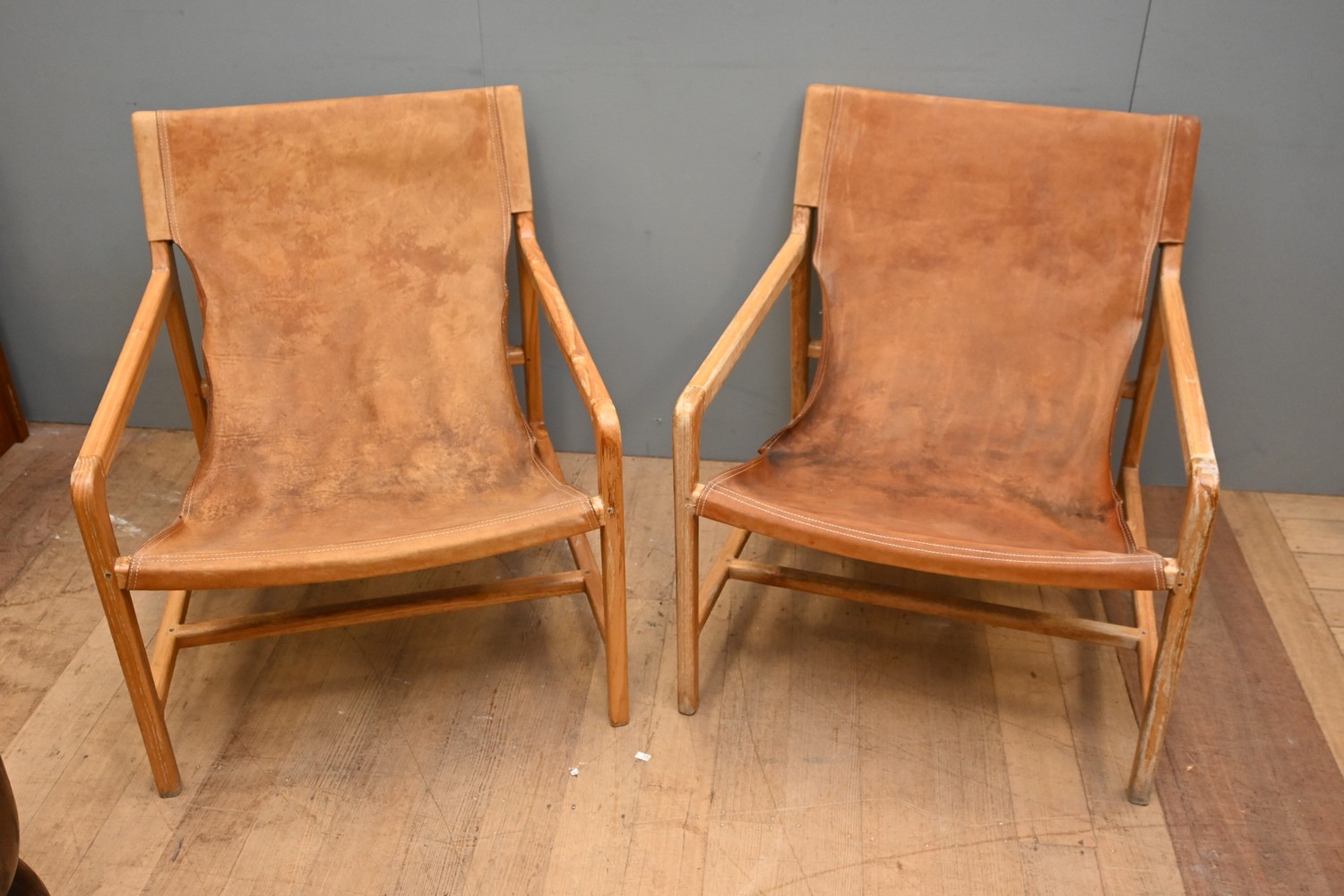 A PAIR OF MID-CENTURY DANISH STYLE LEATHER SLINGBACK ARMCHAIRS (A/F) (80H X 68W X 75D CM) (LEONARD JOEL DELIVERY SIZE: X-LARGE)