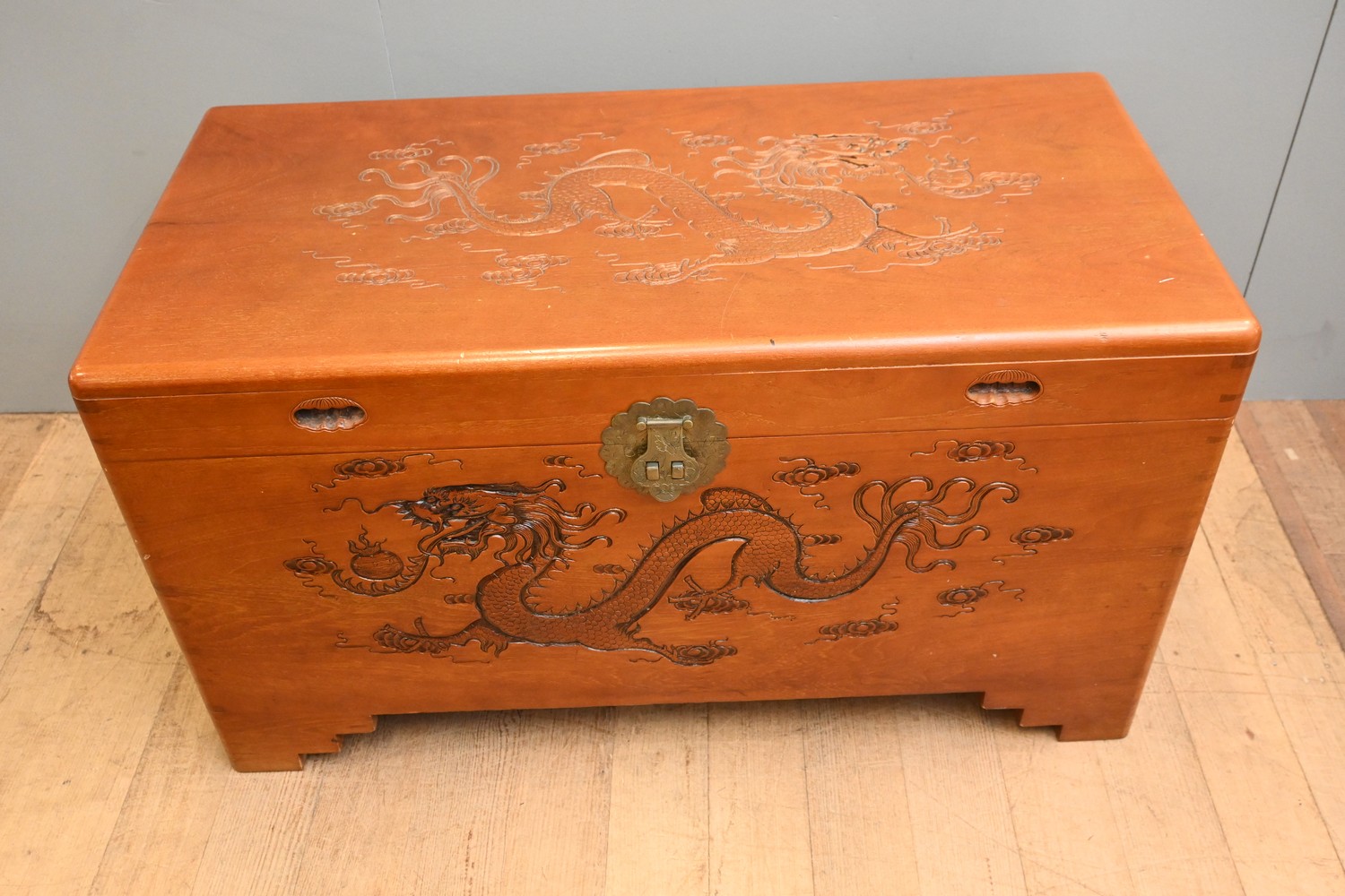 A CHINESE TEAK CHEST, CAMPHORWOOD-LINED INTERIOR FITTED WITH A TRAY (A/F) (56H X 100W X 49D CM) (LEONARD JOEL DELIVERY SIZE: X-LARGE)