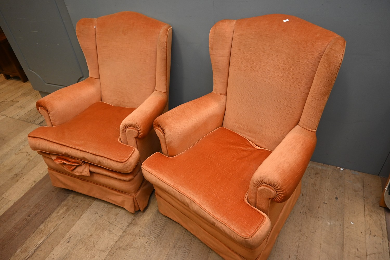 A PAIR OF VELVET WINGBACK CHAIRS BY RICHARD BISGROVE (A/F) (103H X 73W X 87D CM) (PLEASE NOTE THIS HEAVY ITEM MUST BE REMOVED BY CARRIERS AT THE CUSTOMER'S EXPENSE. LEONARD JOEL STAFF CANNOT ASSIST CARRYING THIS ITEM) (X-LARGE ITEM)