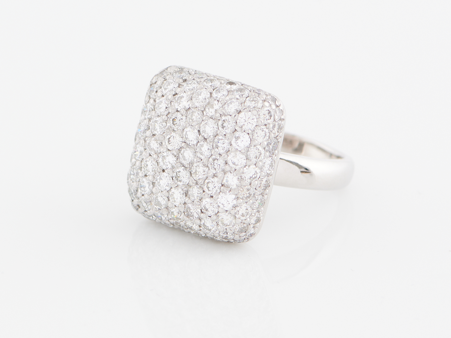 A DIAMOND PAVE RING IN 18CT WHITE GOLD, RING SIZE P, THE DIAMONDS TOTALLING 3.55CTS (F/VS-SI), 14.8GMS, ACCOMPANIED BY VALUATION