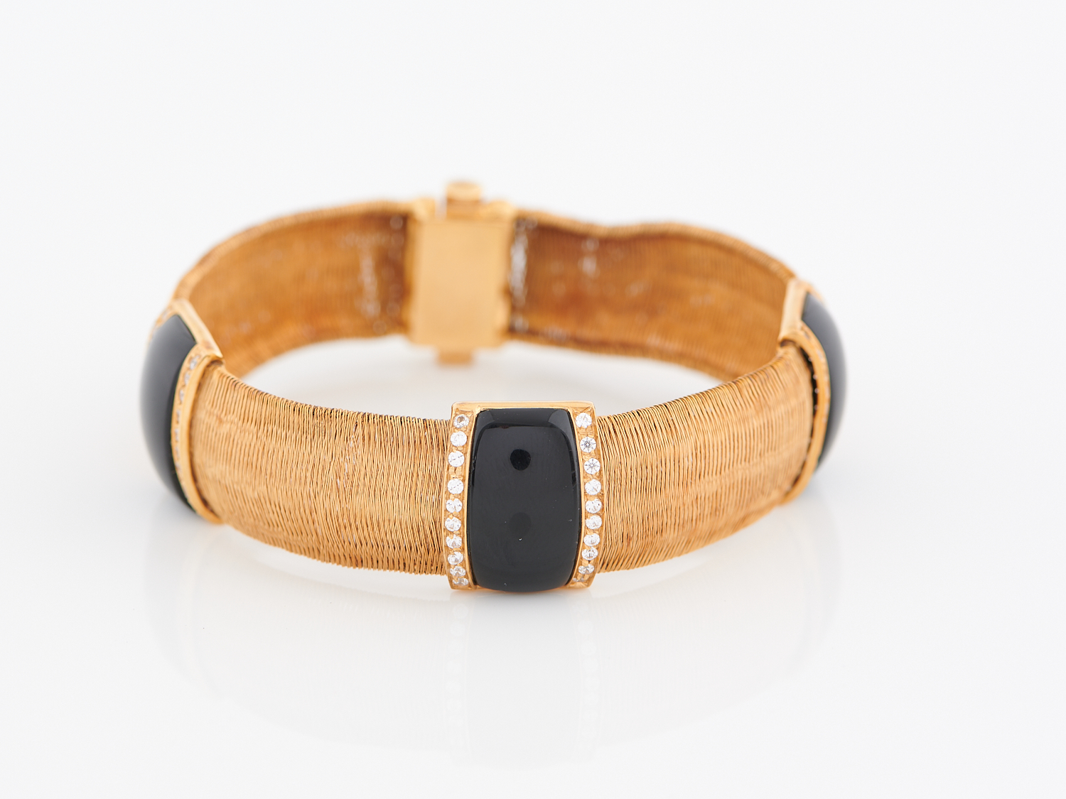 Some minor damage to the mesh nearest to the clasp (please see attached images). The clasp is in working order. No abrasions to the onyx and all diamonds in place and secure