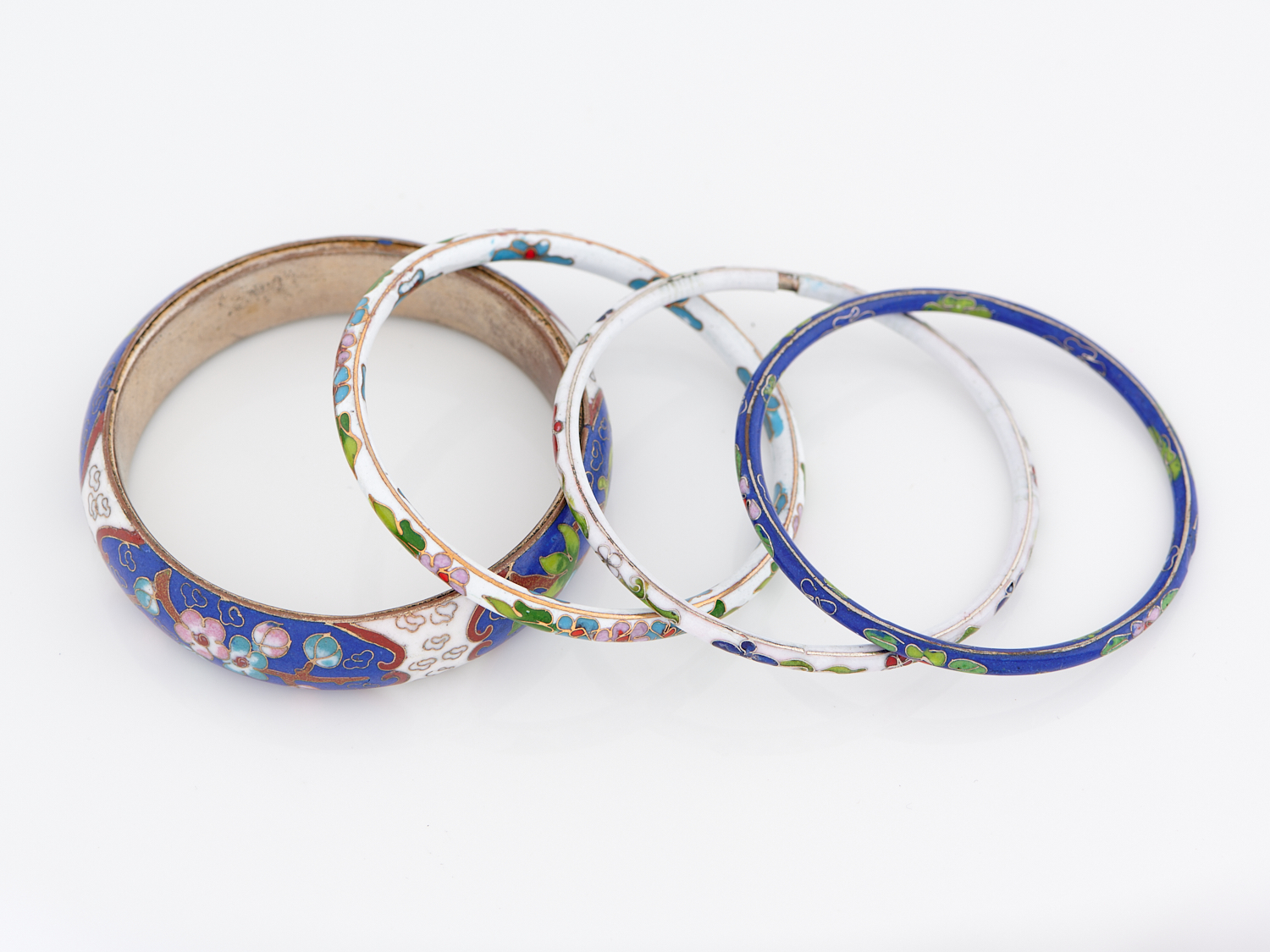 A COLLECTION OF FOUR ENAMEL BANGLES IN SILVER AND BASE METAL