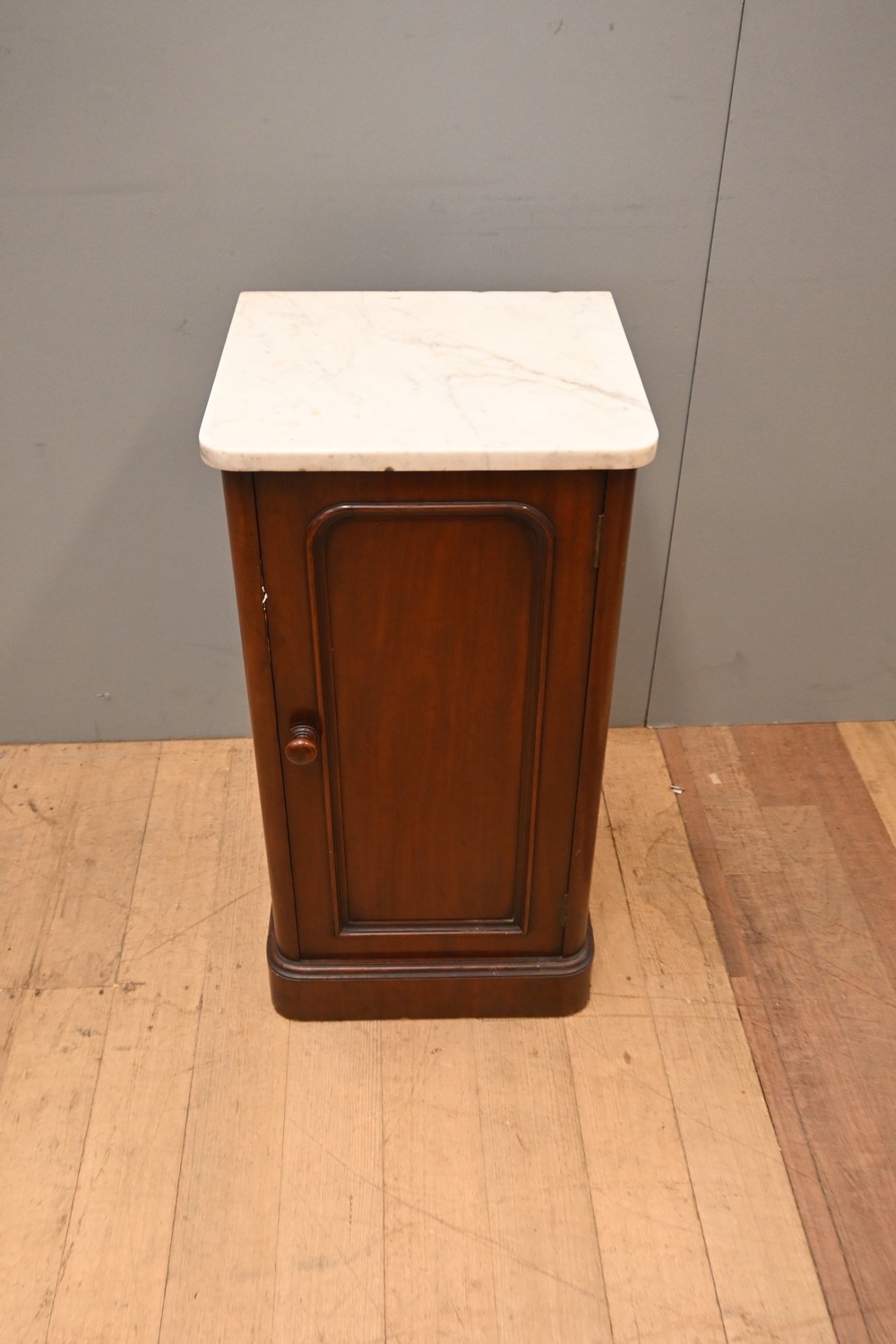 A VICTORIAN MARBLE-TOPPED MAHOGANY BEDSIDE CUPBOARD, MADE BY JENKS & WOOD, LONDON (A/F) (75H X 38W X 35D CM) (LEONARD JOEL DELIVERY SIZE: LARGE)