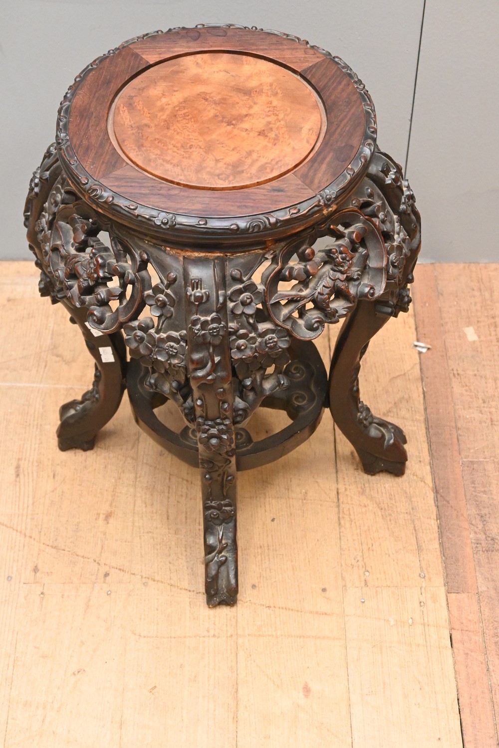 A CHINESE CARVED ROSEWOOD STAND, WITH AN INSET BURR WOOD TOP (A/F) (47H X 36DIA CM) (LEONARD JOEL DELIVERY SIZE: LARGE)