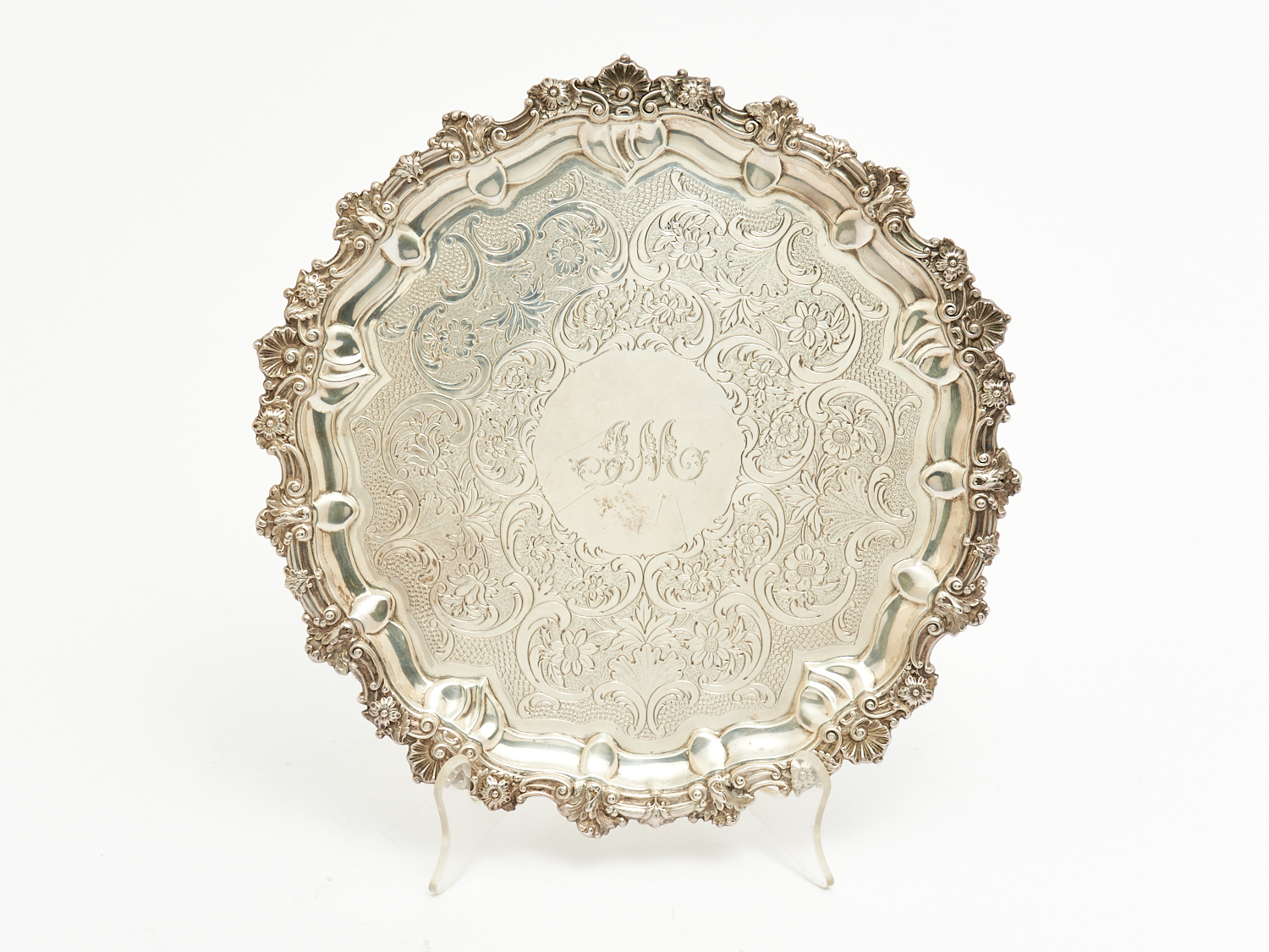 A GEORGE III STERLING SILVER SALVER MONOGRAMMED 'J.M.', J MCKAY, EDINBURGH DIA. 26CM, 604G, LEONARD JOEL LOCAL DELIVERY: SMALL