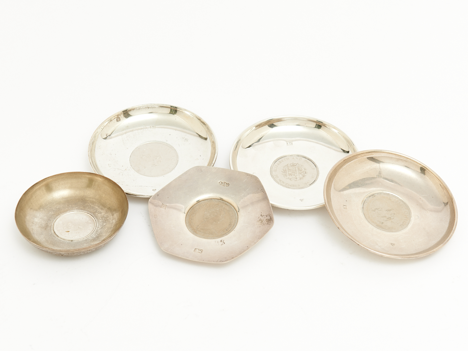 FOUR STERLING SILVER COIN INLAID DISHES AND ONE OTHER DISH 10.5CM (LARGEST), LEONARD JOEL LOCAL DELIVERY: SMALL