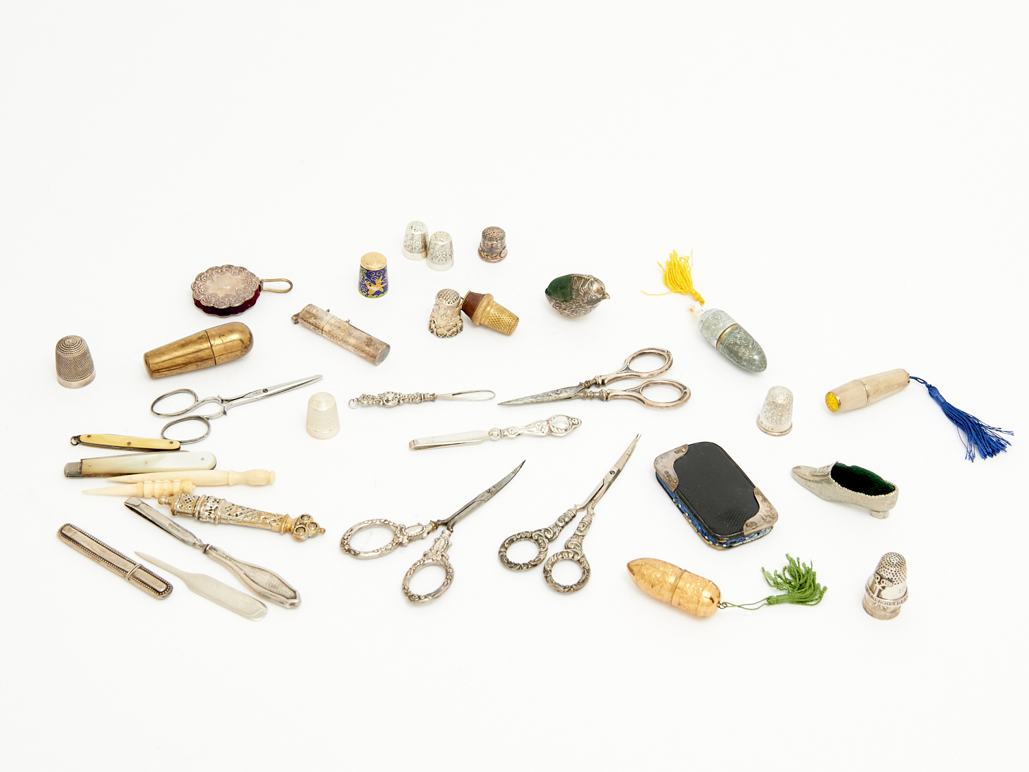 A GROUP OF STERLING SILVER, EP AND STEEL SEWING UTENSILS, THIMBLES AND BOXES, LEONARD JOEL LOCAL DELIVERY: SMALL